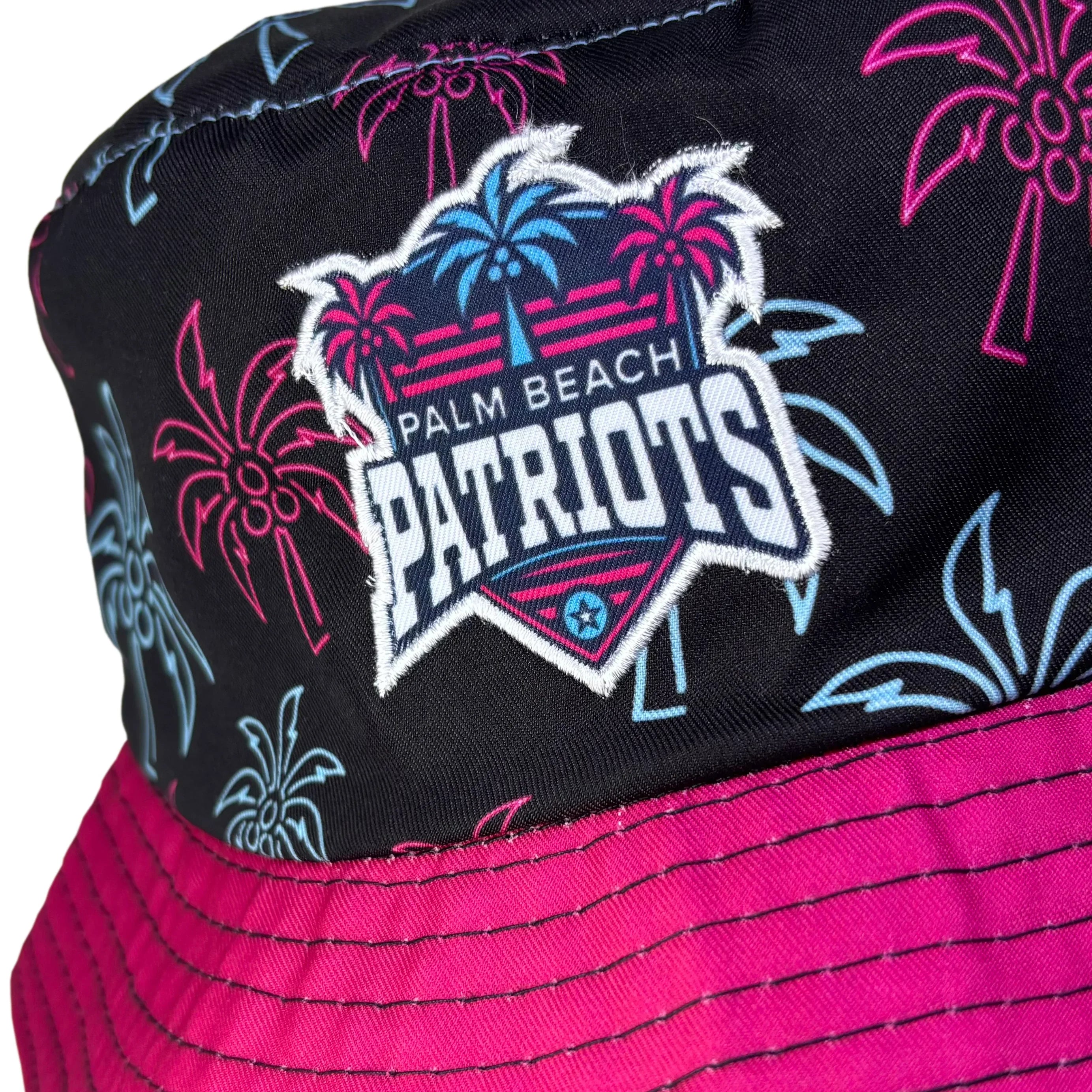 Bring some tropical flair to your look with the Palm Beach Patriots Bucket Hat, featuring a vibrant palm tree pattern and bold team embroidery. With a bright pink brim and lightweight, breathable construction, this hat keeps you cool and shaded while showing your support. Perfect for sunny days, festivals, or cheering from the sidelines.