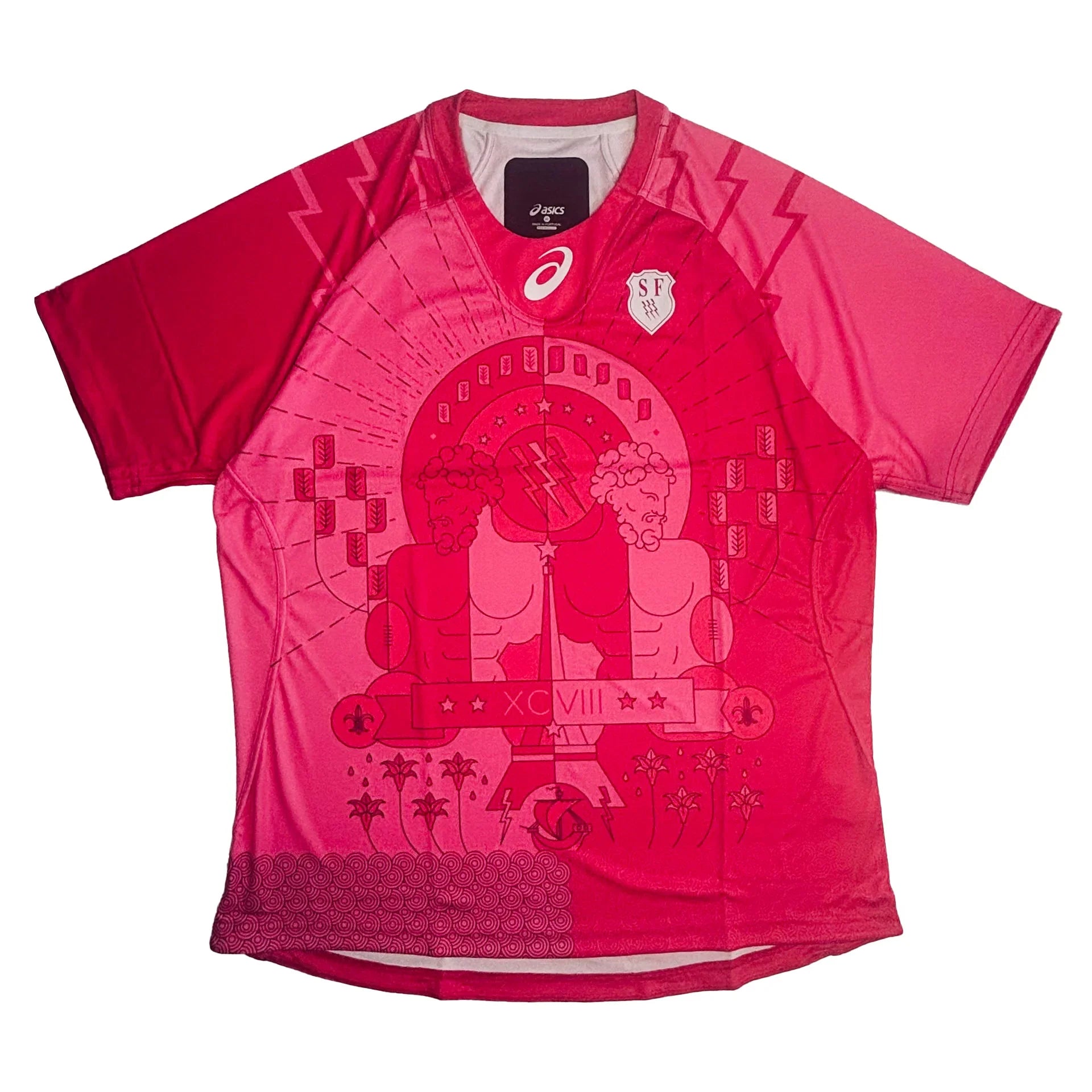Bold and eccentric, this Stade Français 2015/16 away shirt stands out with its artistic Roman-inspired graphic. Designed for performance with a tight match fit, it showcases the club’s flair and fearlessness. A true collector’s item for fans of Parisian rugby culture.