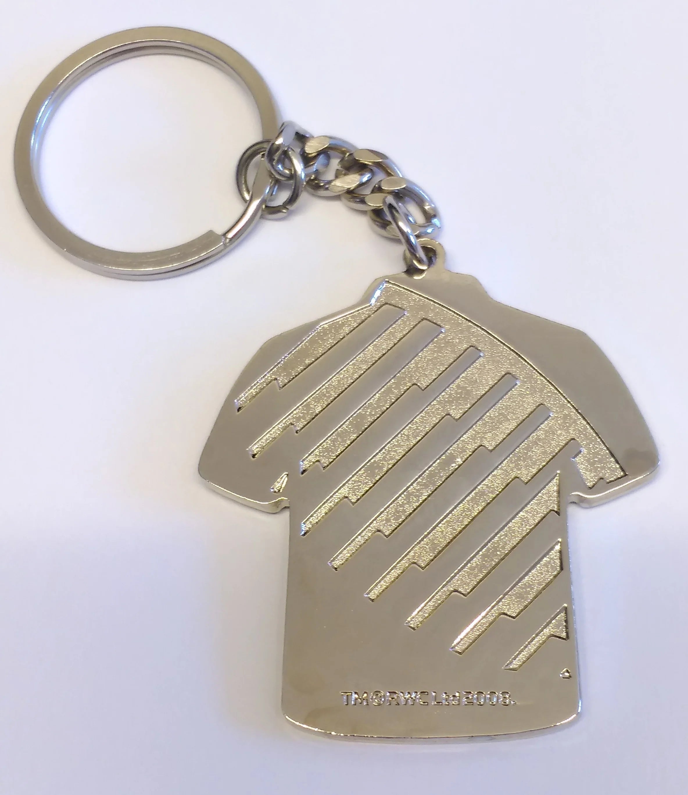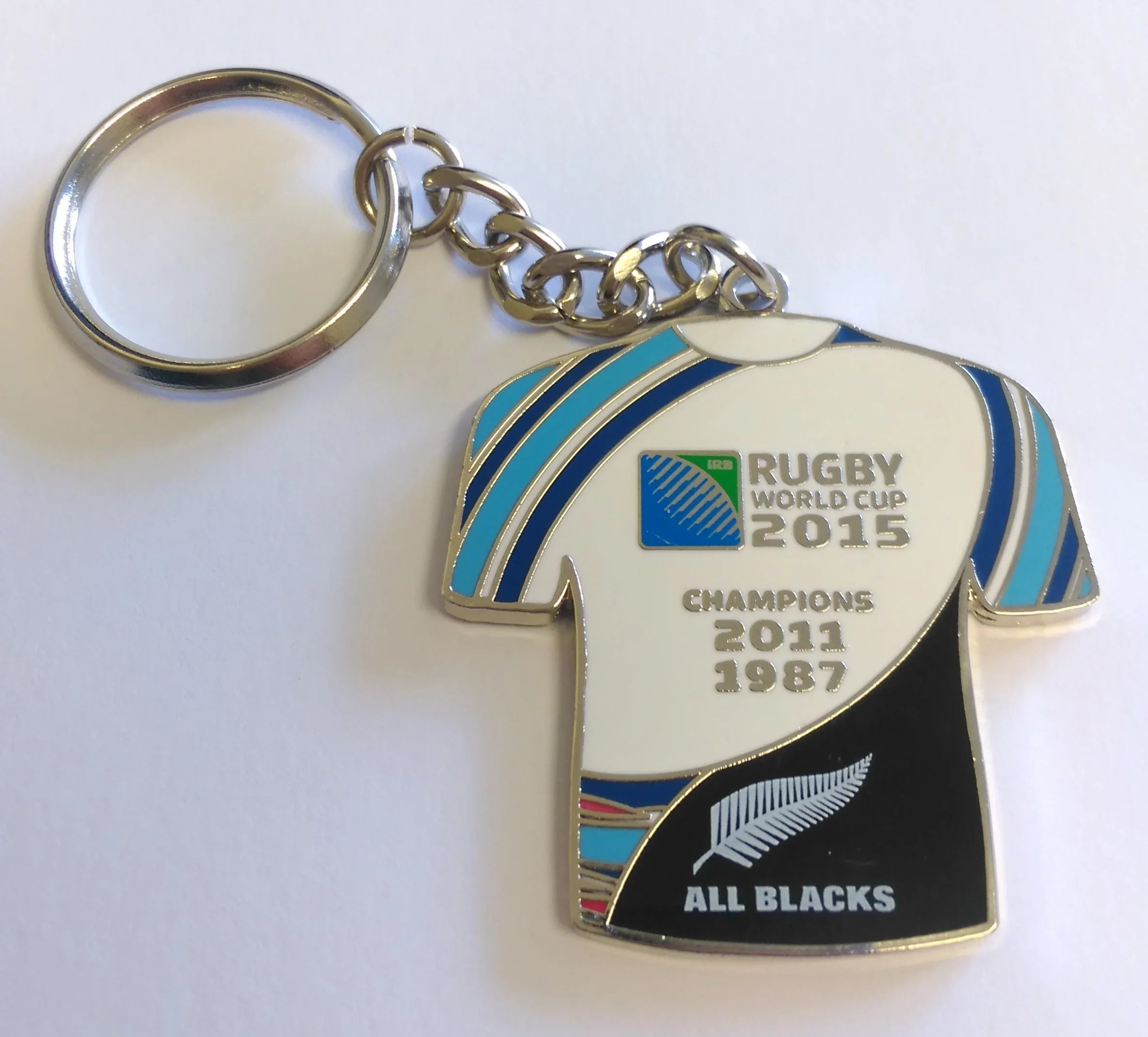 Montrez votre soutien aux champions en titre de la Coupe du monde de rugby, les All Blacks de Nouvelle-Zélande. Ce porte-clés en forme de maillot arbore le logo All Blacks sur le devant avec le logo RWC 2015 et les années où ils ont été sacrés champions. De plus, au dos se trouve un logo IRB gravé.