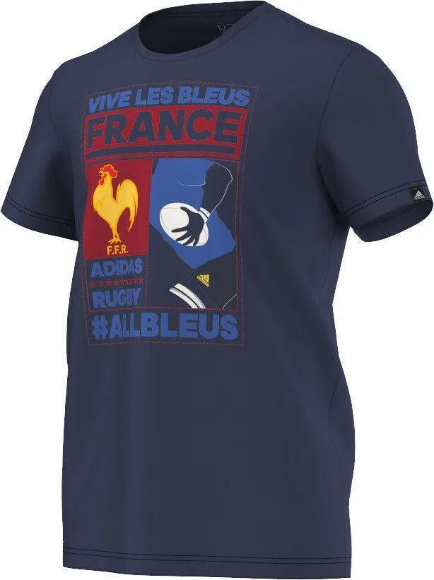 Adidas FFR t-shirt with graphics in the theme of the French national team. The T-Shirt comes in navy and has a cool graphic of the French Rugby Emblem and a French Rugby player illustration on the chest. This tee is a must for any French fan.