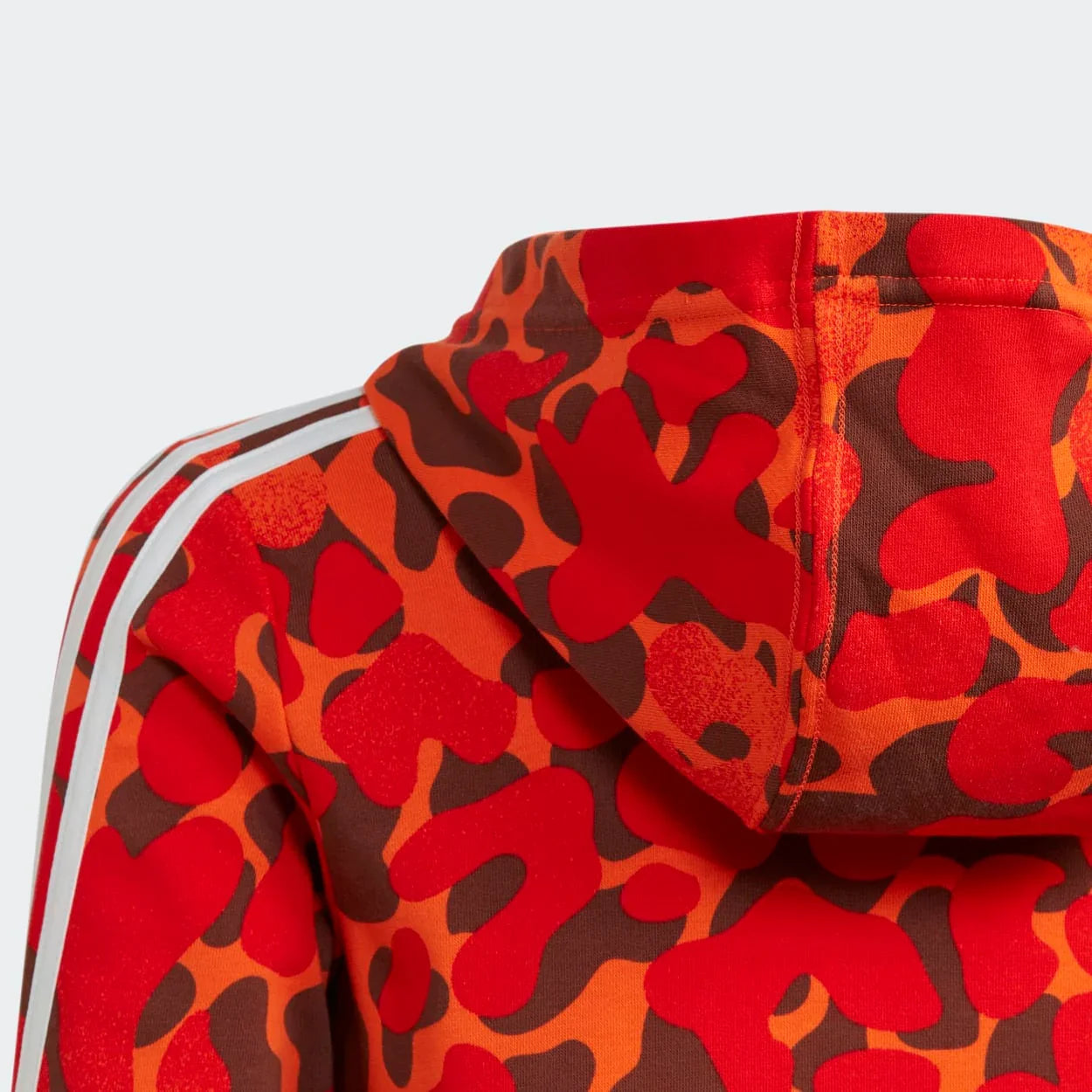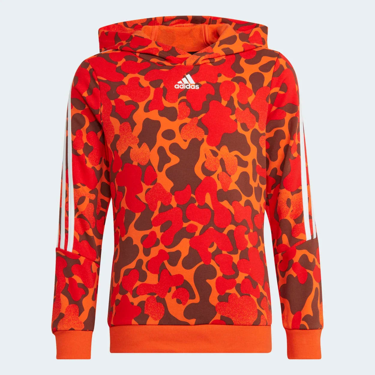Level up your sweatshirt game. This juniors' adidas hoodie combines an allover camo print with wrapping 3-Stripes that can be seen from all sides. The longer length offers extra warmth and coverage. Made in part with recycled content generated from production waste, e.g. cutting scraps, and post-consumer household waste to avoid the larger environmental impact of producing virgin content.