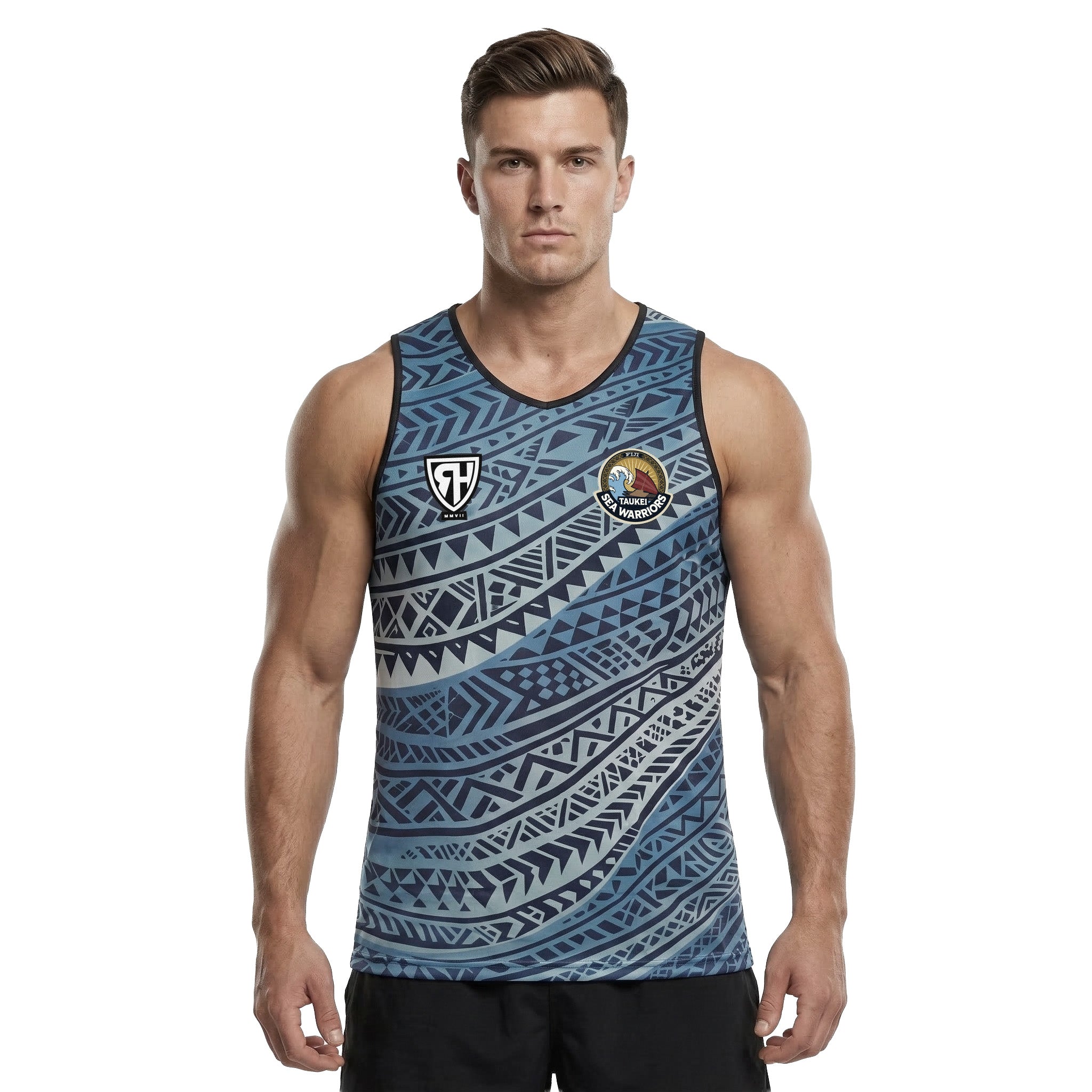 The Taukei Sea Warriors Mens Rugby Vest Blue is a sleeveless training top designed for rugby sessions, gym work, and warm-weather wear.